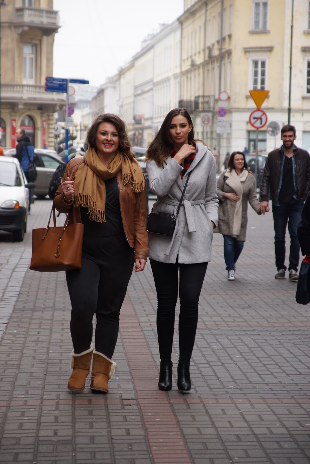 Umówiłyśmy się na późne, weekendowe śniadanie, każda z nas miała potem inne plany i dobrała inną stylizację. Ja założyłam kostium, który świetnie pasuje do szpilek, ale taki outfit pokażę Wam innym razem. Na tę okazję wybrałam Emu, które ociepliły cały look, bo z kolei na górę założyłam skórzaną, wiosenną skórę. Nie ukrywam, że zmarzłam, ale bardzo mi zależało, żeby pokazać Wam kontrast ciężkich, zimowych butów z lekką, wiosenną kurtką. Ola z kolei wybrała miejski styl z czarnymi rurkami i koszulą w kratę, która według mnie świetnie wygląda zarówno do szpilek, jak i do trampek. Całość stylizacji przełamała przytulnym szarym płaszczykiem.