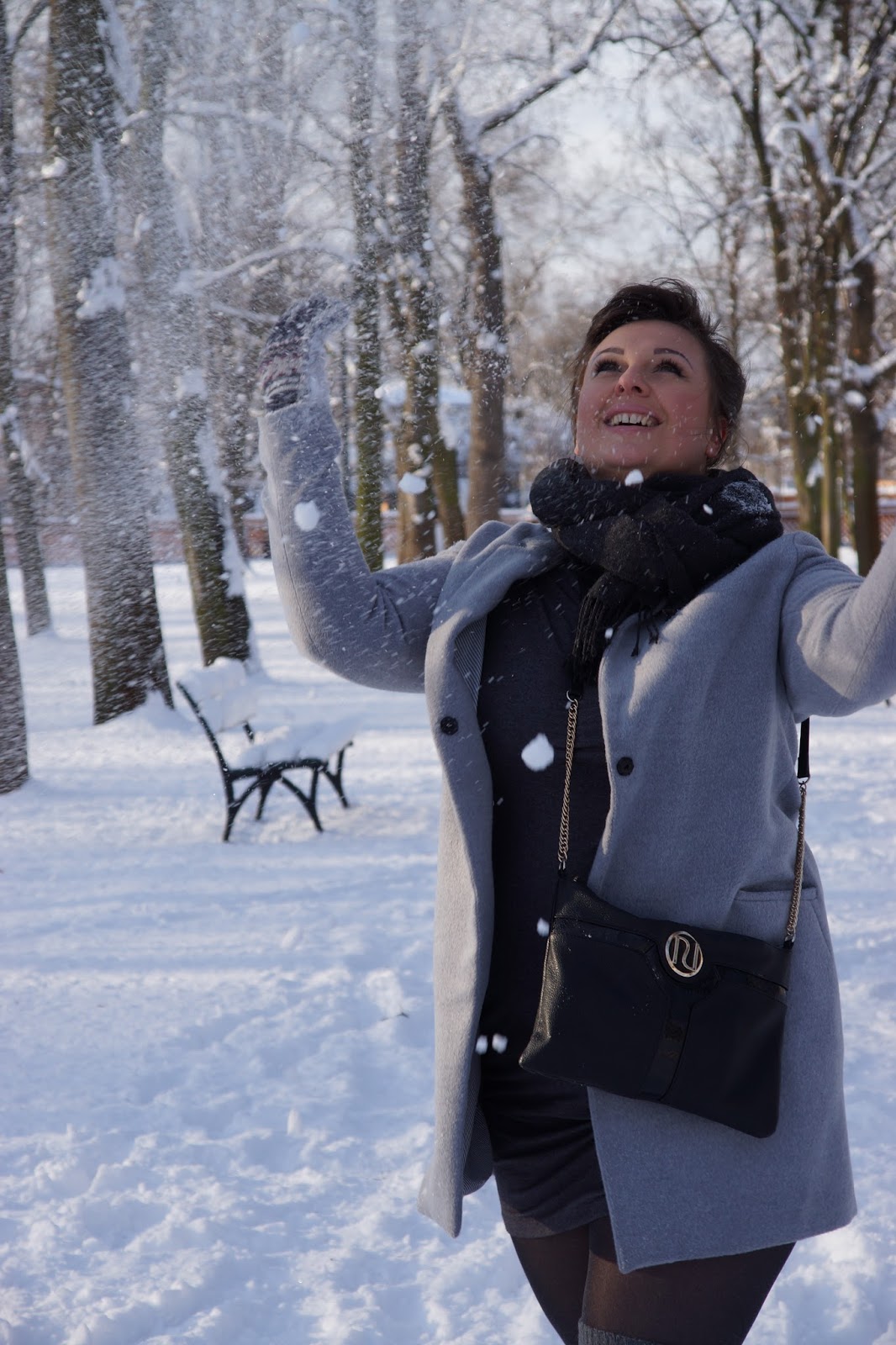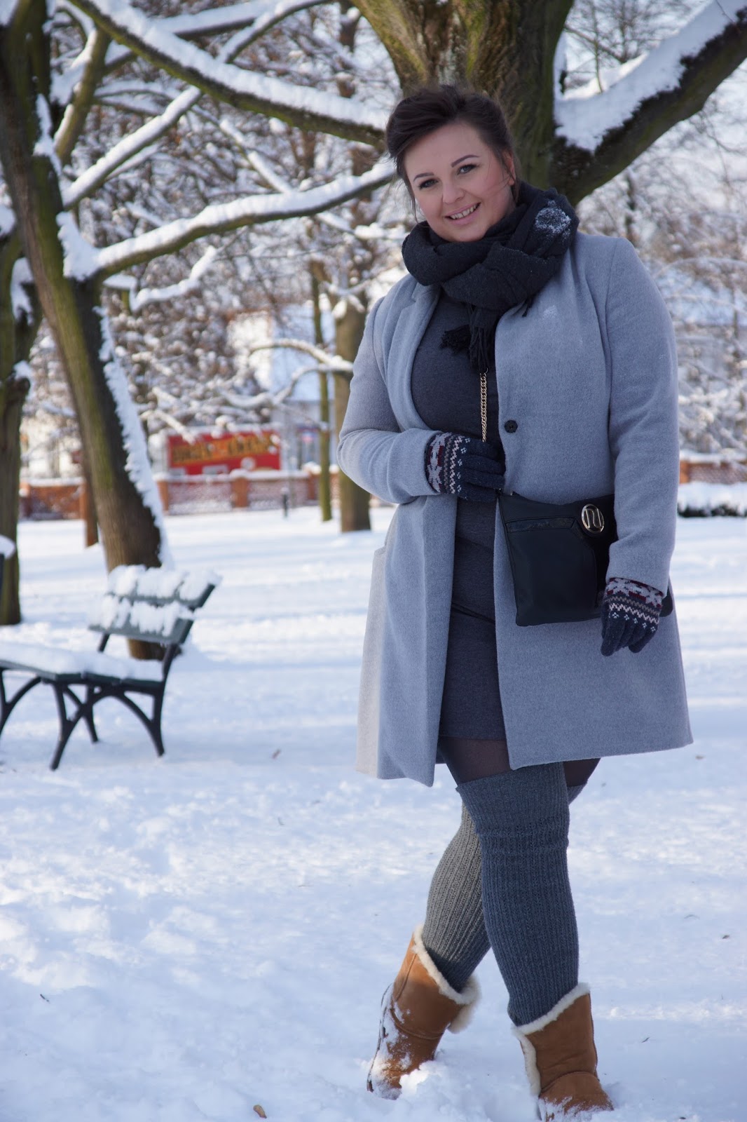 Najpierw powstała fryzura, która w sumie miała być warkoczem ale Ewa, która mnie czesała, poszła za głosem weny i zaproponowała coś pomiędzy klasycznym i współczesnym klimatem. Następnie powstał pomysł, żeby do pięknego białego, wręcz bajkowego otoczenia skontrastować jednolitą stylizację z różnymi odcieniami szarości i wieloma przytulnymi detalami, które ją ocieplą. I tak powstała poniższa propozycja, ja się w niej czułam rewelacyjnie, bo pod spodem miałam kobiecą, obcisłą sukienkę, a do tego zimowe buty Emu i zakolanówki, które tuningują look na bardziej zimowy, weekendowy, niezobowiązujący. Dajcie znać, czy przypadła wam do gustu moja propozycja. 🙂